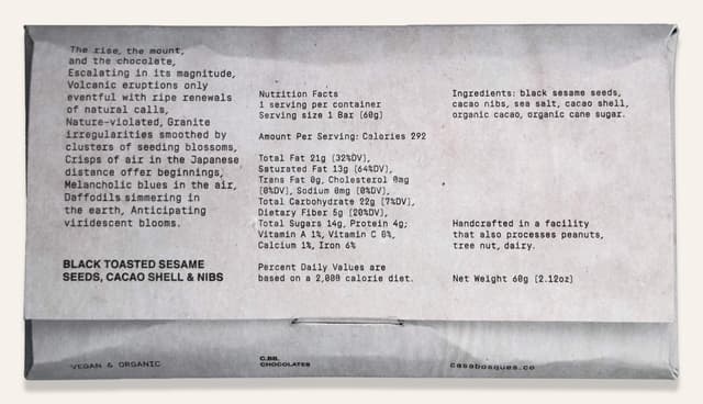 - Black Sesame SeedsCacao NibsSea SaltCacao ShellOrganic CacaoOrganic Cane Sugar